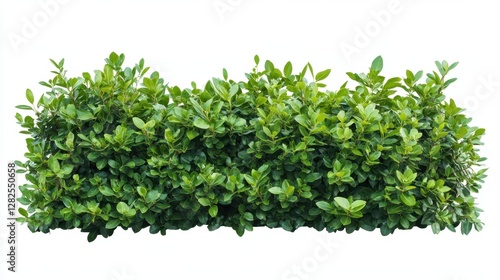 A green hedge with leaves is shown in a white background. The hedge is full of green leaves and is very dense