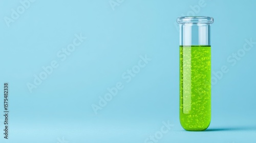 A green liquid in a glass tube is sitting on a blue background