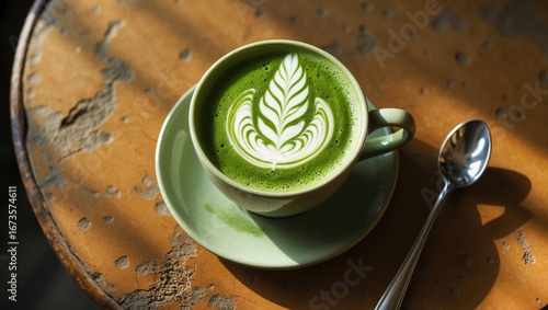 A green matcha latte with latte art in a cup on a rustic wooden table, with a spoon beside it.