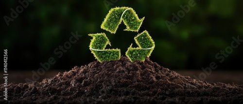 A green recycling symbol made of grass set on a mound of rich soil.