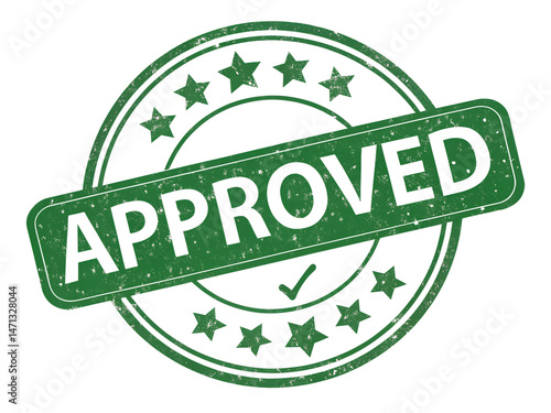A green stamp with the word "approved" written on it. The stamp has a star pattern and he is old and worn isolated on transparent background.