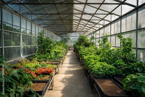 a greenhouse with many plants in it, in the style of linear perspective