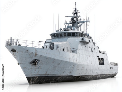 A grey naval vessel, detailed and modern, is presented against a plain white background.