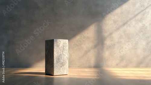 A grey stone block sits in a room with a window