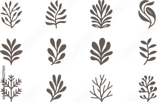 A grid displays twelve simple stylized leaf and branch illustrations in a muted grey tone