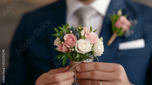 A groom's boutonniere featuring pink and white flowers for a wedding ceremony.