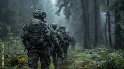 A group consisting of soldiers is walking through a dense forest