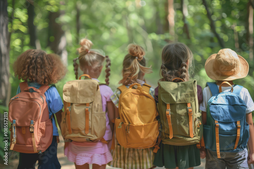 A group of children with backpacks standing in the park near the school.
