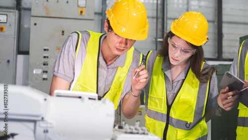 A Group of engineer are examining machine robot arm with smart tablet. Installation indoor industrial factory. Technician coworker check for repair maintenance electronic operation with remote system