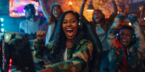 A group of friends celebrate a victory in a video game, expressing excitement and joy.