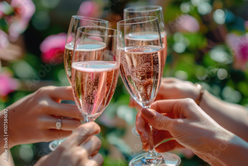 A group of friends toasting with champagne glasses in a beautiful outdoor garden setting during daylight.