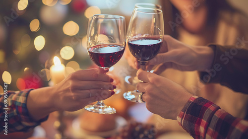 A group of friends toasting with glasses of wine at a home party. Cozy atmosphere.