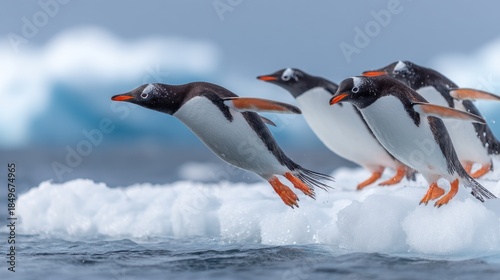 A group of lively penguins leaps off an ice floe, creating splashes in the chilly water. Majestic icebergs rise in the background, showcasing the beauty of the frozen wilderness