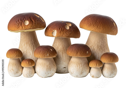 A group of mushrooms with brown caps and white stems arranged together on a plain background. isolated on transparent background