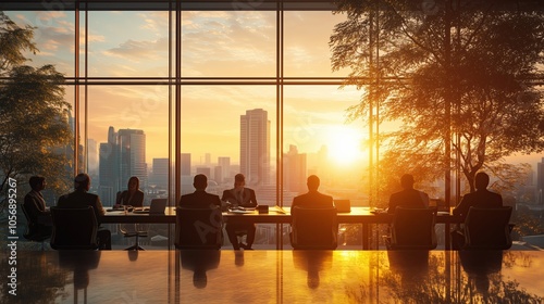 A group of people are sitting in a conference room with a view of the city and a sunset