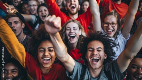 A group of people are smiling and cheering, with some of them wearing red shirts