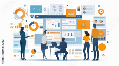 A group of people are working on a computer screen with various graphs