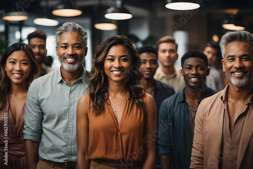 A group of people in casual dress, posing and smiling in a cool coworking space.