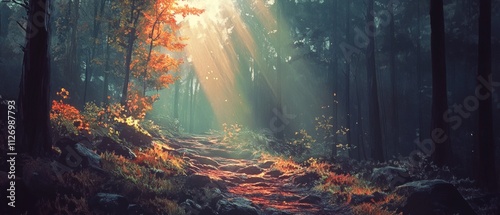 A group of people is rucking along a peaceful wooded trail, enjoying autumn's colors and warm sunlight filtering through the trees