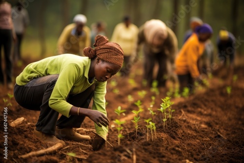 A group of people painstakingly plant seedlings in rich soil. They are dressed in outdoor clothing, their faces are focused and determined, working towards sequestrating carbon by cultivating