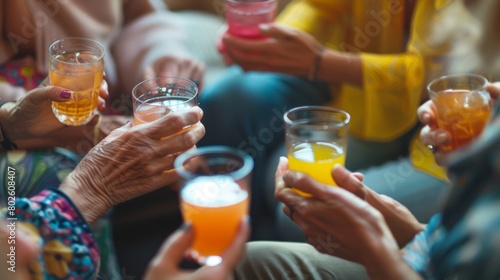A group of people sitting in a circle each holding a glass of juice and engaging in lively conversation.