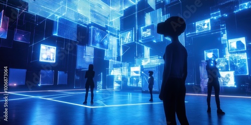 a group of people standing in a room with a large screen