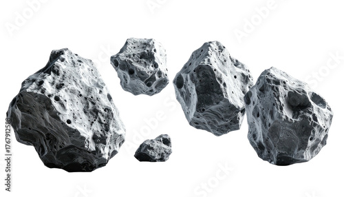 A group of rocky, gray asteroids, varying in size, isolated against a black, dark space backdrop