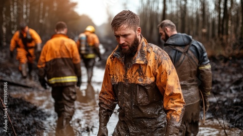 A group of rugged workers in orange and muddy gear walk through a forest, displaying teamwork and resilience as they navigate the muddy landscape with purpose.