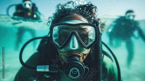 A group of scuba divers in clear blue water with focus on one diver wearing a mask, exploring the serene depths of the ocean with visible bubbles and light.