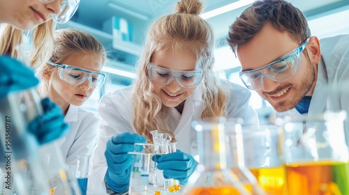 A group of students in a science lab, conducting experiments under the guidance of a teacher, representing hands-on learning in education.