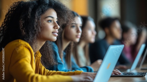 A group of students of various ages sitting at home, focused on their laptops during an online class, symbolizing the modern shift towards remote education.