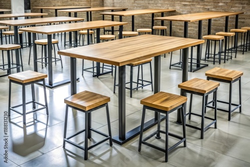 A group of tables with stools and chairs arranged in a U shape, lounge seating, seating arrangement