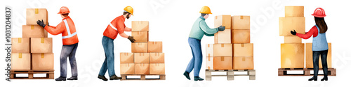 A group of workers, wearing safety gear, handling and stacking wooden boxes on pallets in a warehouse setting.
