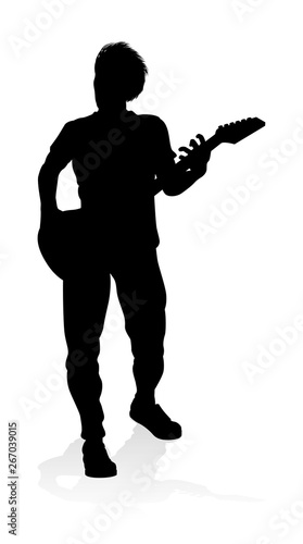A guitarist musician in detailed silhouette playing his guitar musical instrument.