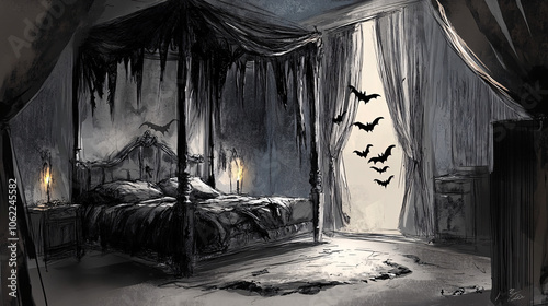 A Halloween-themed bedroom sketch, featuring a canopy bed with dark, tattered curtains, and bats flying across the walls.