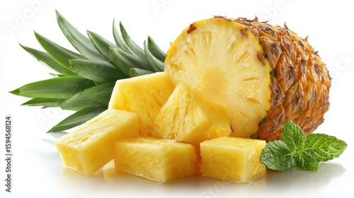 A halved pineapple with leaves, cubes, and mint on white. Use it to show tropical fruit, healthy eating, or a summer theme.