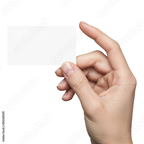 A hand holding a blank white business card isolated on transparent background