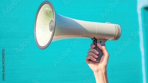 A hand holding a megaphone against a blue background