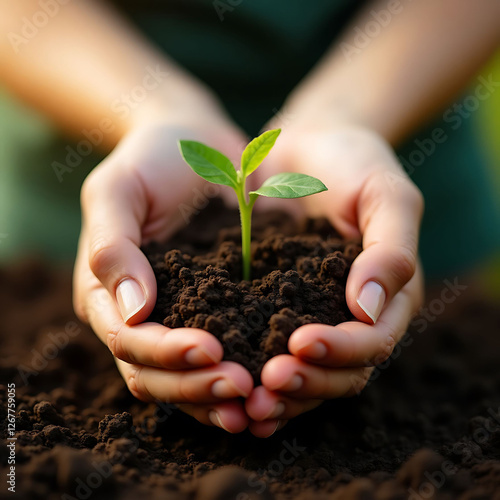 A hand holding soil with small green plants sprouting, against a blurred background, environmental conservation concept, Sustainable Development, created with generative ai