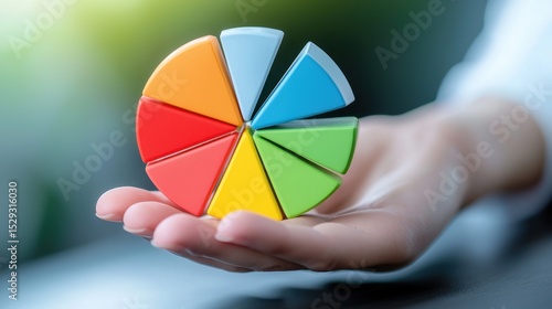 A hand holds a colorful pie chart, symbolizing data analysis, teamwork, or project management in a modern, professional setting.