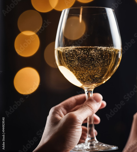 A hand holds a glass of sparkling wine in front of a blurred background of golden lights
