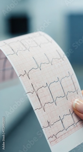 A hand holds a long electrocardiogram printout, showing heart rhythm data.