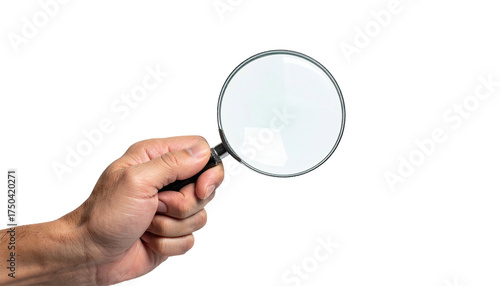 A hand holds a magnifying glass, centered against a black background