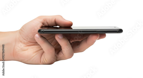 A hand holds a thin black smartphone horizontally isolated on a solid transparent background for mobile communication advertising projects.