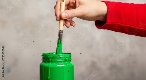 A hand in a red sleeve dips a paintbrush into a jar of bright green paint, causing drops to splash.