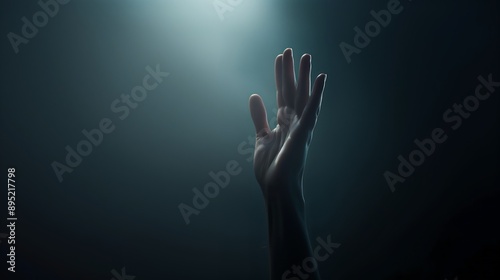 A hand in the dark reaches out to the light. Hope, salvation, or a solution concept. Generative AI.