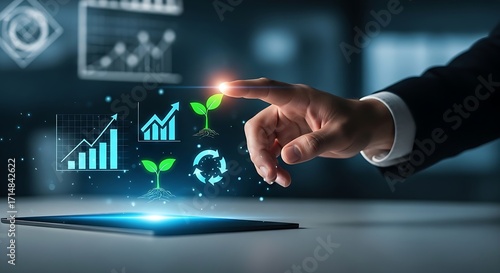 A hand interacting with digital growth icons above a tablet on a dark background with suit sleeve visible