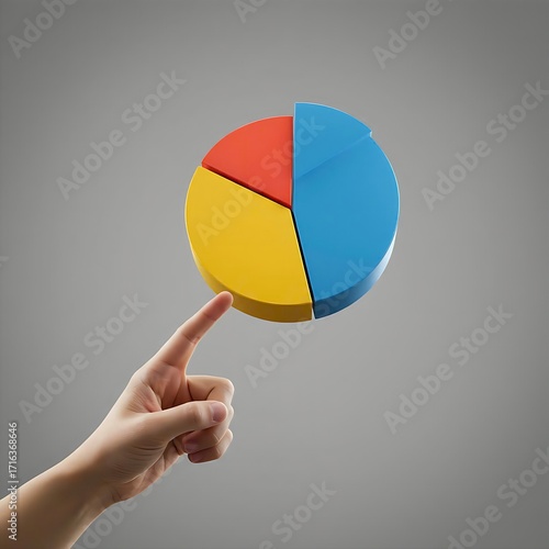A hand is balancing a dimensional pie chart on one finger. The chart is divided into three sections of different colors: blue, yellow, and orange. The background is a clean, minimalist gray. Thi