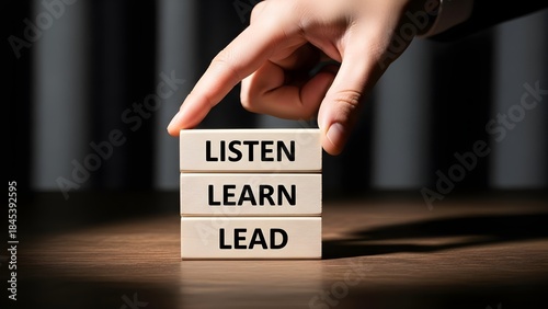 A hand placing a block on top of three wooden blocks with 'LISTEN', 'LEARN', and 'LEAD' text on a wooden surface with a dark background.