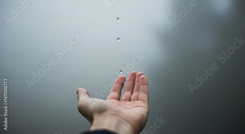 A hand reaches up to catch falling raindrops